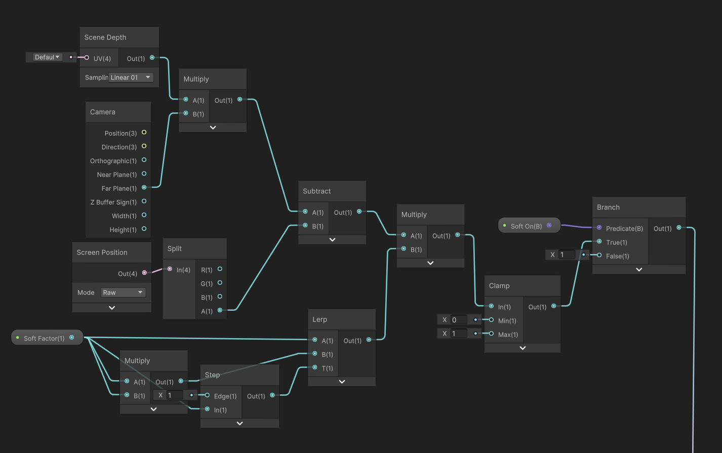 整体构造是这样, 其中Soft Factor使用lerp(x, x*x, step(1,x)), 当x小于1的时候, 走$y=x$曲线, 当x大于1的时候走$y=x^2$. Soft On用来做切换总开关.