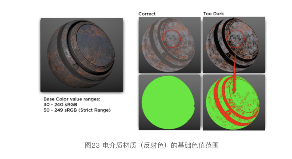说到亮度范围,这里通常是指非导体(电介质)材质反射的颜色。在图23中,你可以看到污垢的色值超出正确亮度范围的效果(红色区域)。对于暗色值,尽量不要低于30-50 sRGB,严格控制下应该不低于50 sRGB。对于亮色值,贴图中也不应该有色值高于240 sRGB。