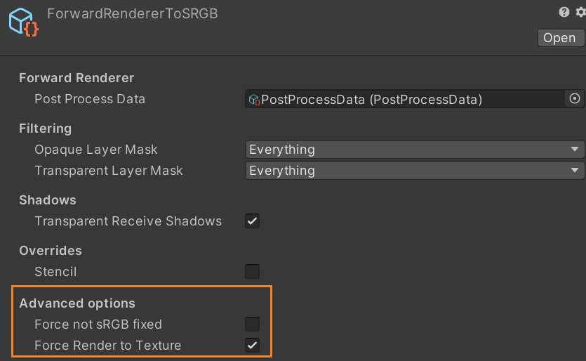 public bool ForceNotSRGB { get => m_ForceNotSRGB; } bool m_ForceNotSRGB; public bool ForceRenderToTexture { get => m_ForceRenderToTexture; } bool m_ForceRenderToTexture; ... public ForwardRenderer(ForwardRendererData data) : base(data) { ... m_ForceNotSRGB = data.forceNotSRGB; m_ForceRenderToTexture = data.forceRenderToTexture; ... }