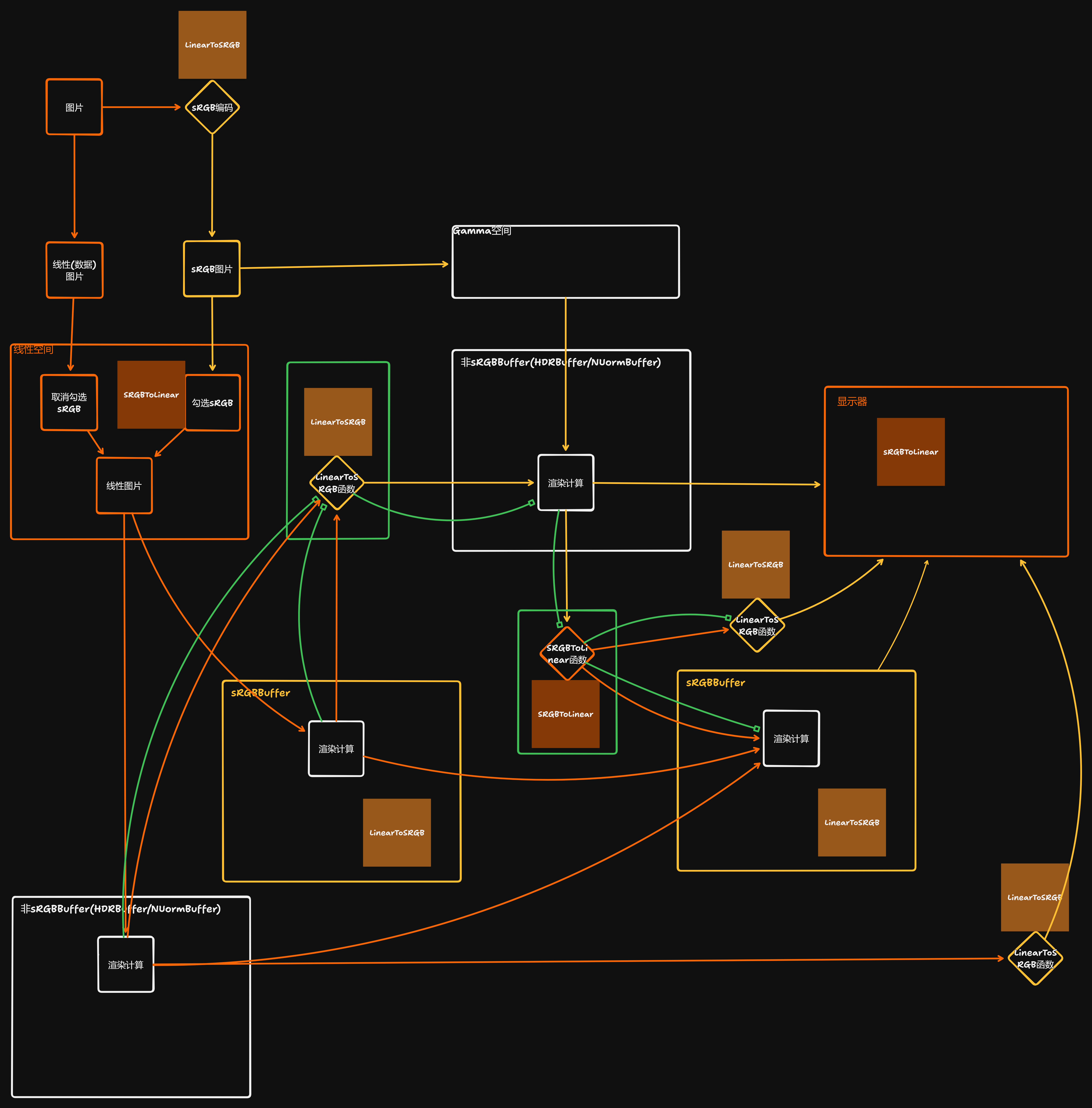 白色部分: 该部分仅进行渲染计算, 不涉及颜色空间变换